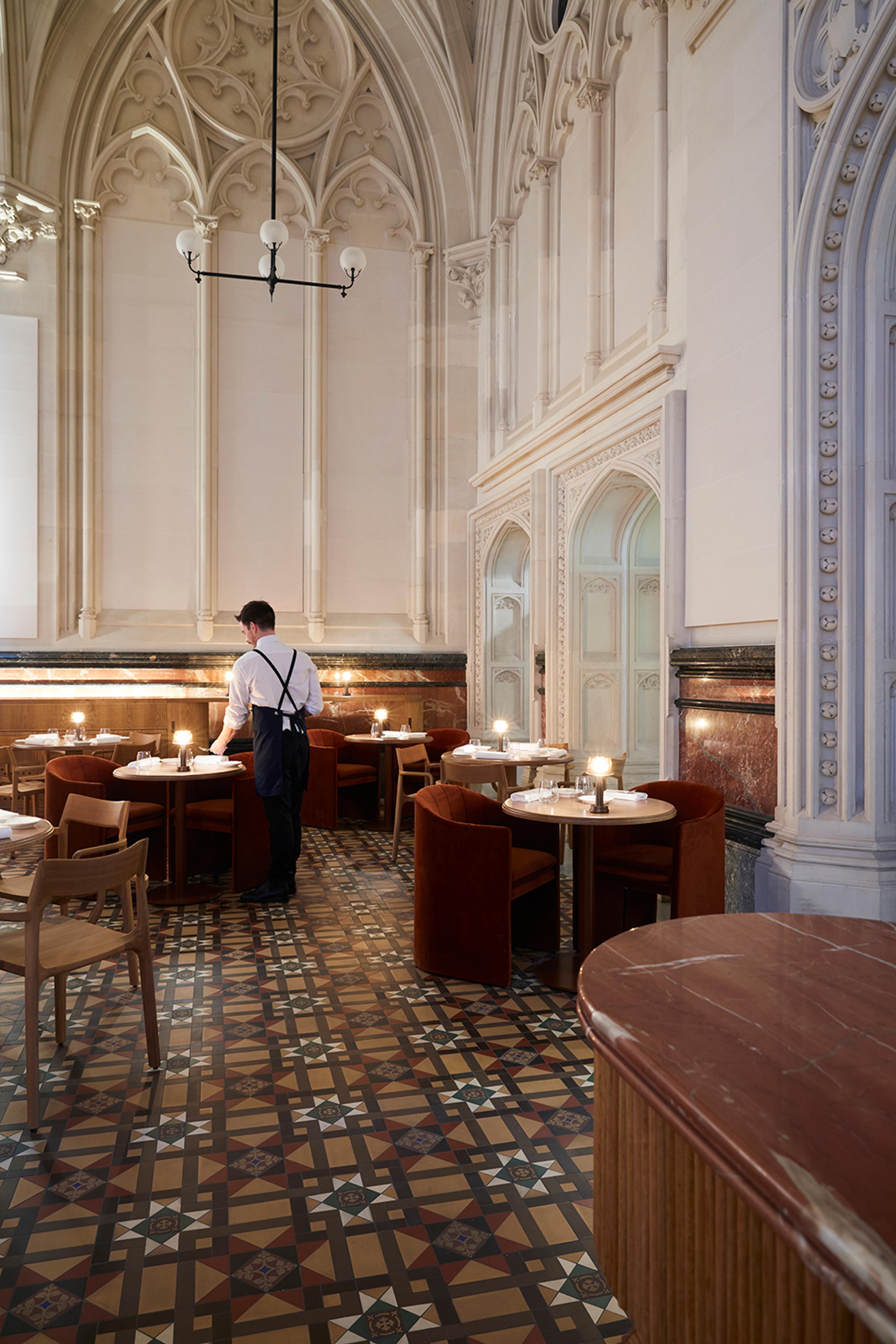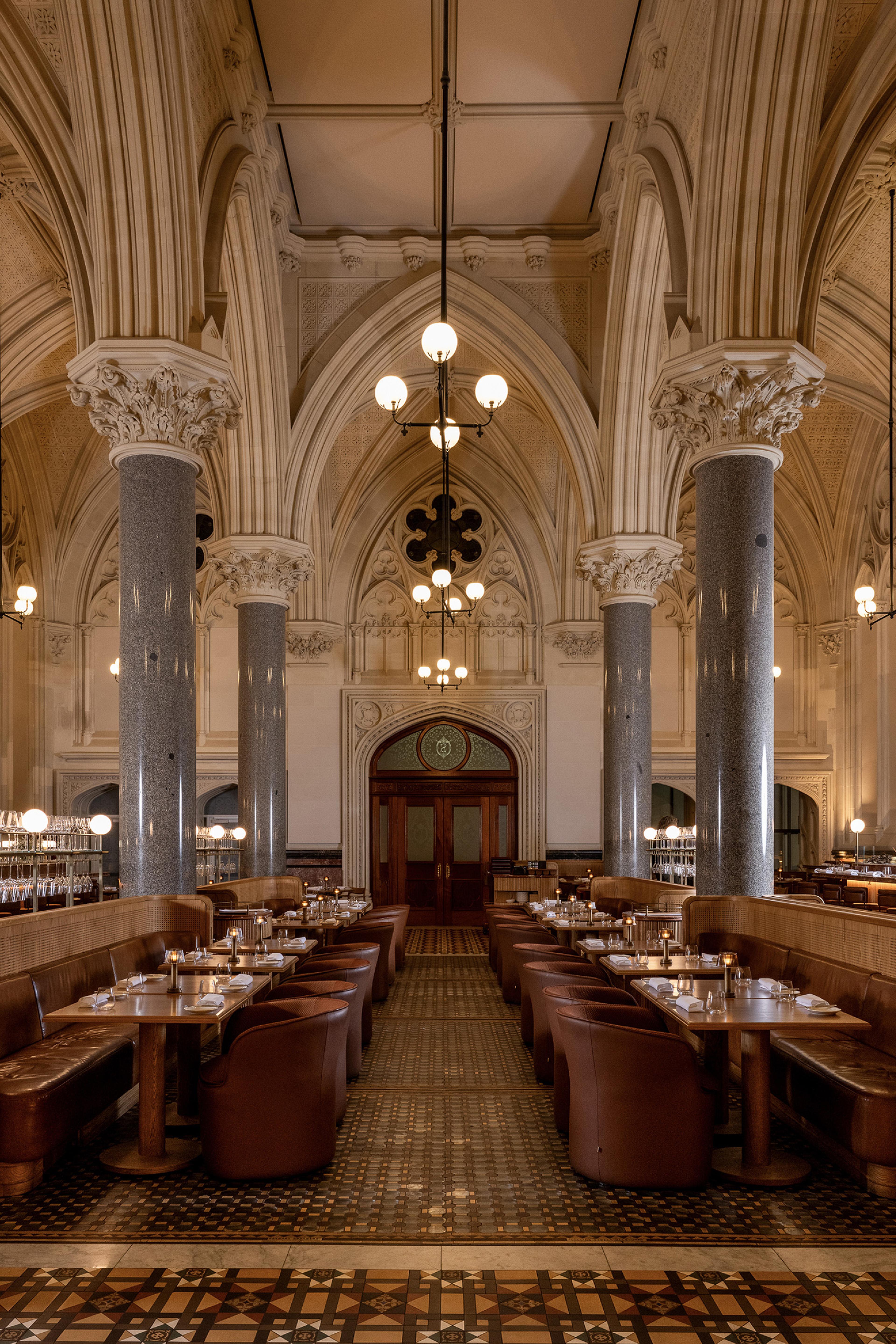 Situated in the heart of Melbourne's CBD, Reine & La Rue occupies a neo-Gothic cathedral dating back to the 1890s. The landmark building has undergone a thoughtful restoration, preserving its original heritage with gothic detailing, solid limestone walls, vaulted ceilings, and granite columns.
