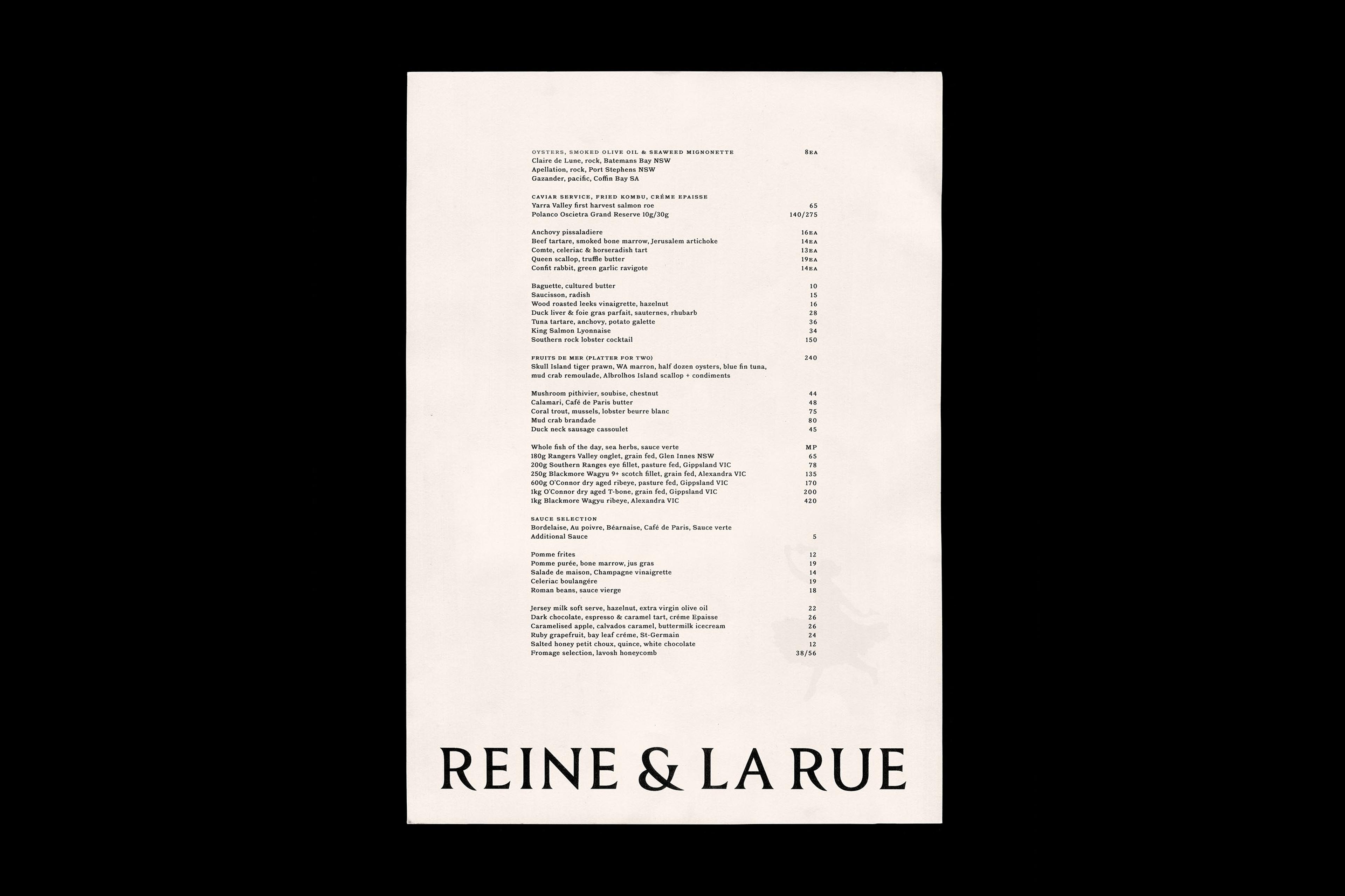 Reine & La Rue, a two-hatted establishment, specialises in French cuisine, offering a range from small bites and entrées to wood-fired meats. The restaurant was also recognised as the AGFG Good Food Guide New Restaurant of the Year 2024.